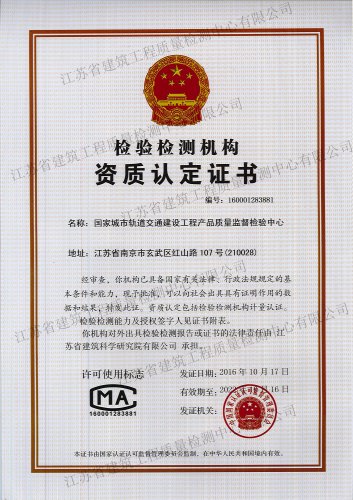 國家城市軌道交通建設(shè)工程產(chǎn)品質(zhì)量監(jiān)督檢驗中心, 依托江蘇省建筑科學研究院和江蘇省建筑工程質(zhì)量檢測中心在城市軌道交通建設(shè)工程領(lǐng)域的綜合技術(shù)優(yōu)勢,于2016年10月獲得國家認證認可監(jiān)督委員會批準授權(quán)..